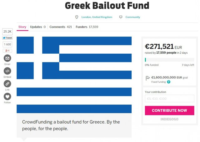 Кампания по добровольному сбору средств, организованная Фини на краудфандинговом сайте IndieGoGo, началась 28 июня. Заявленная цель – собрать 1,6 млрд евро к 7 июля.
