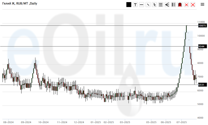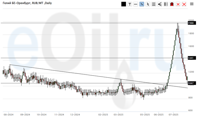 Цены на гелий газообразный, базис поставки Оренбургская область, снизились за неделю на 185 рублей до 1149 рублей за кубический метр.