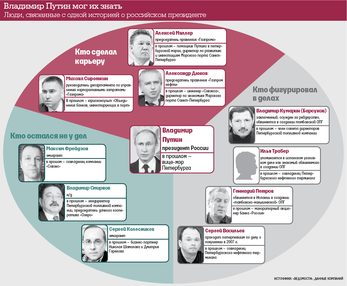 Сам предправления «Газпрома» Алексей Миллер в конце 1990-х гг. был помощником Путина в петербургской мэрии, а затем директором по развитию и инвестициям морпорта и уполномоченным представителем ОБИП.