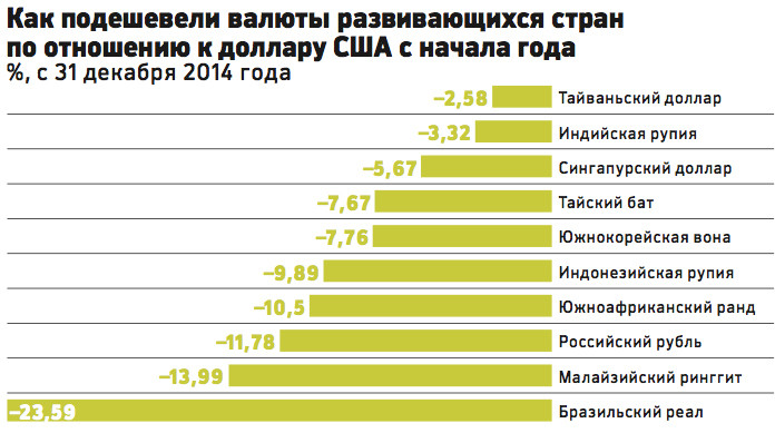 Наконец, в каждом конкретном случае у падения курса национальной валюты могут быть индивидуальные причины. В России рубль дешевеет не только из-за низких нефтяных цен, но и из-за закрытого доступа к мировому рынку капитала. Террористические акты в Таиланде не добавили инвесторам уверенности в стабильности военного режима. Бразилия (реал потерял с начала года 23,6% по отношению к доллару) находится в рецессии. Государственные и частные компании в Индонезии и Малайзии сильно закредитованы, причем их долг номинирован в иностранной валюте. В ситуации низких сырьевых цен этот факт способствует недоверию инвесторов и толкает ринггит и рупию вниз.