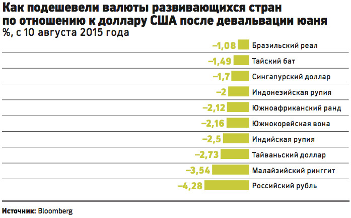 Снижением курсов валюты развивающихся стран ответили на реформу китайского Центробанка, направленную на увеличение роли рыночных факторов при курсообразовании юаня. С 10 августа, перед тем как Народный банк Китая объявил о преобразованиях, юань, по данным Bloomberg, обесценился к доллару на 2,9% — заметное падение для управляемой валюты. Вслед за юанем падение ускорили валюты стран Юго-Восточной Азии. Например, южнокорейская вона потеряла 2,16% стоимости, сингапурский доллар — 1,7%, а тайваньский доллар — 2,73%. Рекордсменом по этому показателю стал российский рубль, подешевевший сразу на 4,28%.